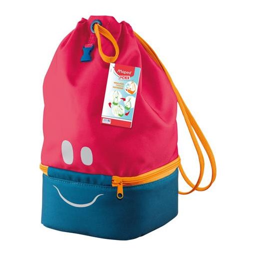 MAPED Picnik "Kids": színes élmény gyerekeknek! Hogy az étkezés az iskolában is élvezetes legyen! felső rész italok és finomságok tárolására alkalmas hőszigetelt alsó rész uzsonnásdoboz az alulsó részben vízszintesen tárolható kompakt tárolást nyújt fényvisszaverő szem- és száj ábra 100% poliészter külső rész űrtartalom: 9l