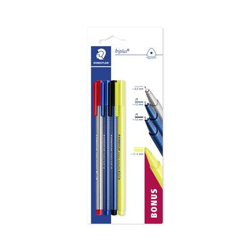 Vegyes Triplus készlet, amely tartalmaz 1 db tűfilcet (0,3mm) piros színben, 2 db golyóstollat (M) kék és fekete színben, és 1 db sárga szövegkiemelőt (1-4mm).