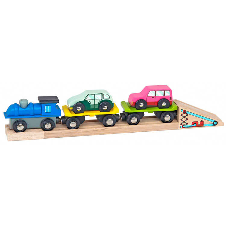 Fából készült színes autószállító vonat autókkal. A vagonok mágnessel kapcsolódnak , így könnyen és egyszerűen csatlakoztathatóak egymáshoz. A szerepjáték segítségével fejlődik a képzelőerő, a nyelvi- és kapcsolatteremtő képesség. Remek kiegészítője lehet bármilyen vonatkészletnek. Kompatibilis minden általunk forgalmazott vonatkészlettel és vonatkészlet kiegészítővel.