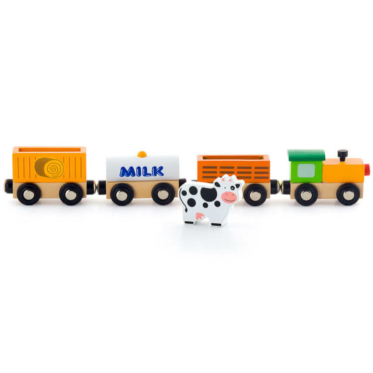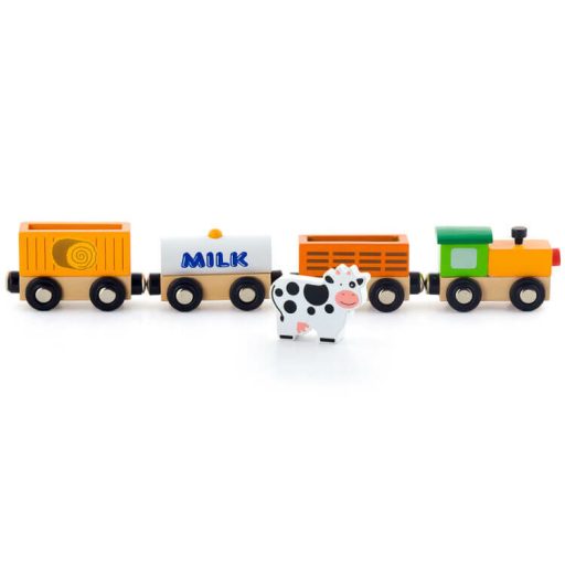 Fából készült színes tehervonatok mozdonnyal. Mágnessel kapcsolódnak , így könnyen és egyszerűen csatlakoztathatóak egymáshoz. A vonatokon különböző rakományok vannak, mely még izgalmasabbá teszi a játékot. Remek kiegészítője lehet bármilyen vonatkészletnek. Kompatibilis minden általunk forgalmazott vonatkészlettel és vonatkészlet kiegészítővel. A játék során fejlődik a gyermek finommotoros készsége, szem-kéz koordinációja és kreativitása.