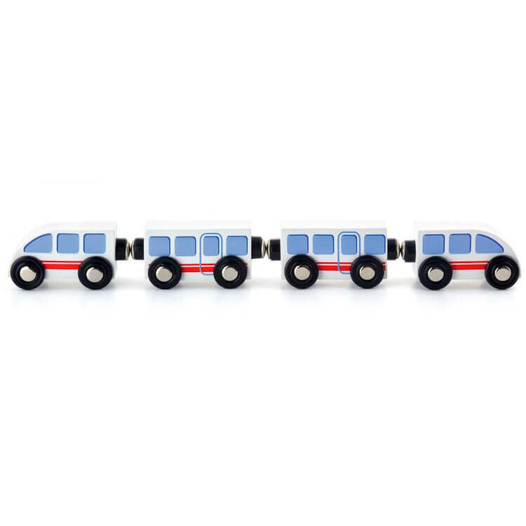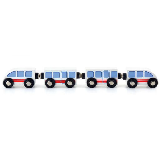 Fából készült színes gyorsvonat. A vagonok mágnessel kapcsolódnak , így könnyen és egyszerűen csatlakoztathatóak egymáshoz. A szerepjáték segítségével fejlődik a képzelőerő, a nyelvi- és kapcsolatteremtő képesség. Remek kiegészítője lehet bármilyen vonatkészletnek. Kompatibilis minden általunk forgalmazott vonatkészlettel és vonatkészlet kiegészítővel.