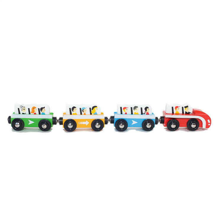Fából készült színes személyvonat. A vagonok mágnessel kapcsolódnak , így könnyen és egyszerűen csatlakoztathatóak egymáshoz. A szerepjáték segítségével fejlődik a képzelőerő, a nyelvi- és kapcsolatteremtő képesség. Remek kiegészítője lehet bármilyen vonatkészletnek. Kompatibilis minden általunk forgalmazott vonatkészlettel és vonatkészlet kiegészítővel.