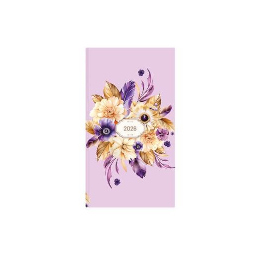 Színes grafikával díszített, matt fóliával bevont, fehér tömbös zsebnaptár, jelzőszalaggal.