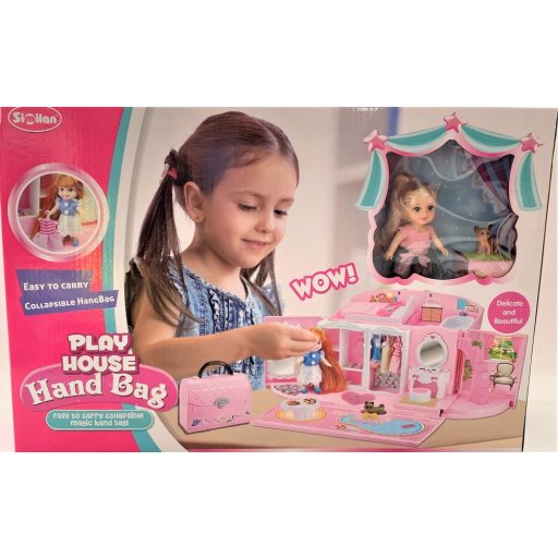 A táskát kinyitva egy kis házikót kapunk. Tartozék hozzá egy baba és az ő kedvenc kis kutyusa.