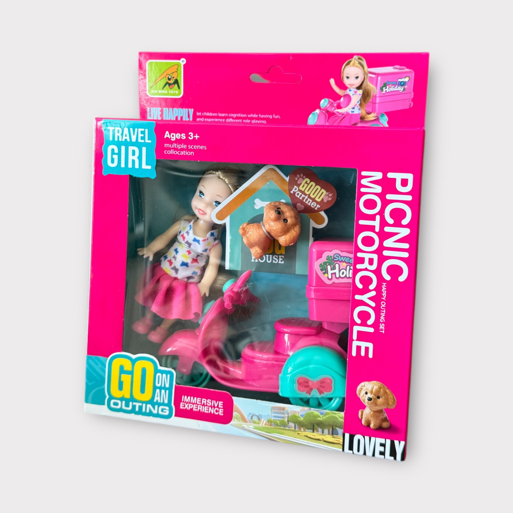 Stílusos utazás vár rád ezzel a cuki robogós játékbaba szettel, ahol a baba és hűséges kis kutyusa együtt fedezik fel a világot!