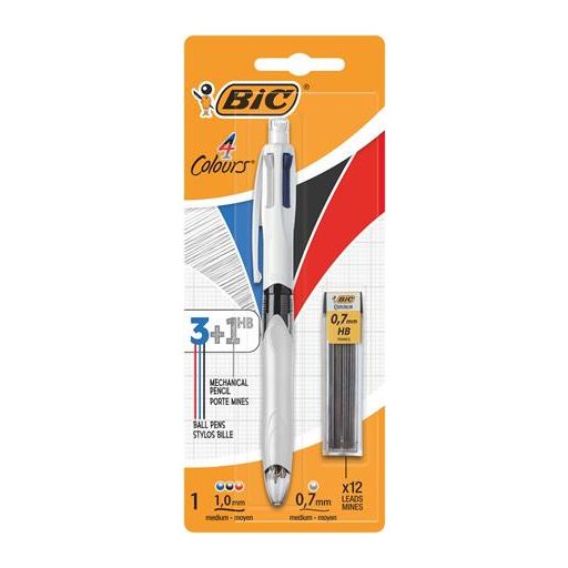 Golyóstoll, háromszínű, nyomósirónnal egyben, BIC "4 Colours" + grafitbél