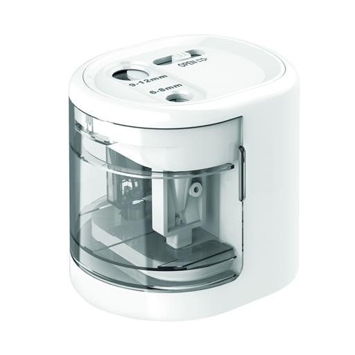 Hegyező, kétlyukú, asztali, elemes, USB töltővel, RAPESCO"PS12-USB", fehér