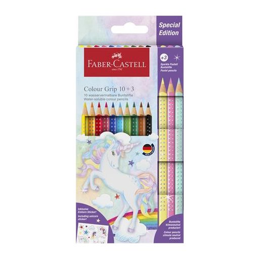 Színes ceruza készlet, háromszögletű, FABER-CASTELL "Grip", 13 különböző szín, unikornis