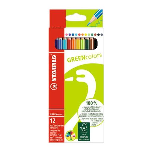 Színes ceruza készlet, hatszögletű, STABILO "GreenColors", 12 különböző szín