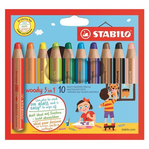 Színes ceruza készlet, kerek, vastag, STABILO "Woody 3 in 1", 10 különböző szín