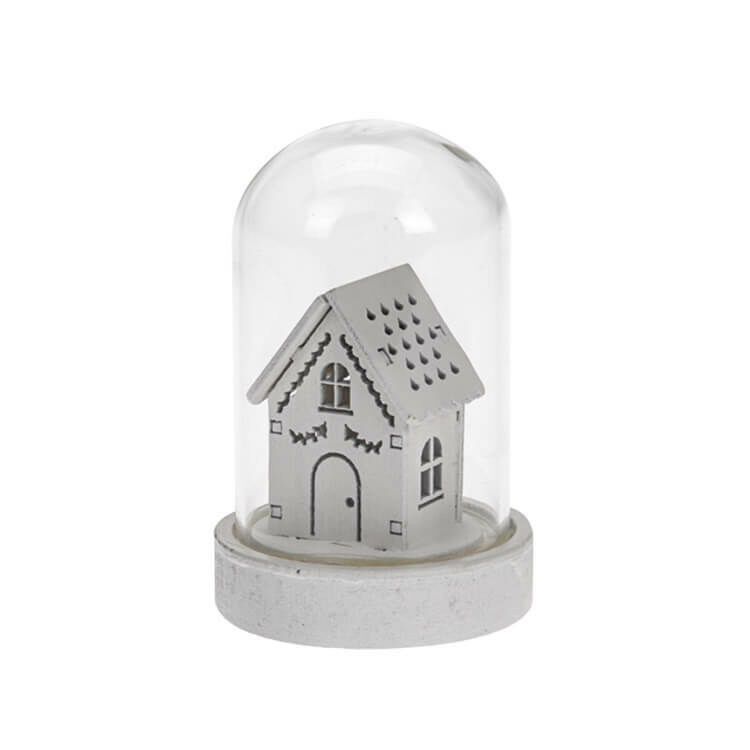 Dekorációs házikó üvegbúrában, LED világítással (fehér, lekerekített ablakokkal)