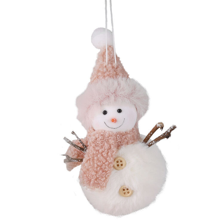 Textilből és plüssből készült karácsonyi dekoráció-plüss hóember rózsaszín sállal és sapkával. Ideális belső terek karácsonyi díszítéséhez.