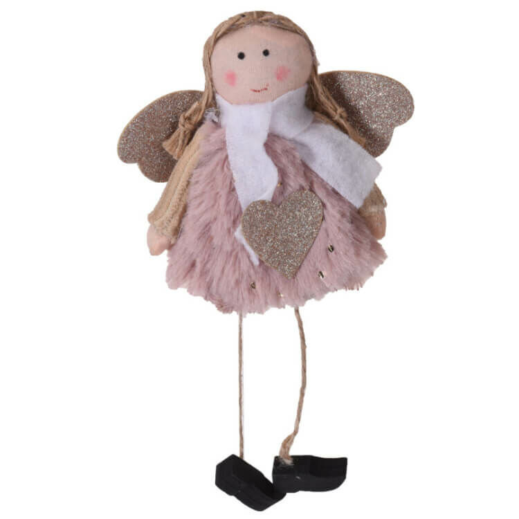 Textilből készült karácsonyi dekoráció-angyal rózsaszín szőrme ruhában arany csillámporos szárnnyal és szívecskével, fekete cipőben. Ideális belső terek karácsonyi díszítéséhez. Termékméret:15x10x2cm Magasság:23cm
